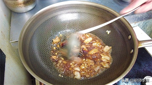 再把剁好的蒜末放入锅中,开大火爆香,加入适量的生抽提鲜,加入一丢丢蚝油增香,
