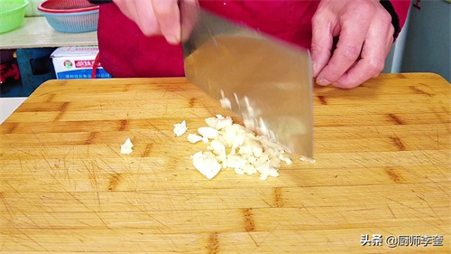 蒜瓣我们趁它不注意一刀把它 拍匀(晕),然后再剁成蒜末,剁好以后装入碗中,