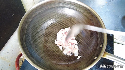 另起锅放入少许食用油,油温烧至五成热时,将切好的五花肉片倒入锅中,