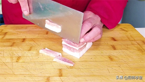 再取两块钱的肥瘦相间的五花肉,首先去掉肉皮,然后切成薄厚均匀的肉片,肉片的厚度跟硬币差不多就可以,切好以后装入碗中备用,