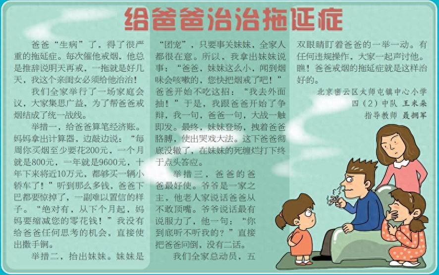 在文字作品中,北京密云区太师屯镇中心小学王米朵同学的《给爸爸治治拖延症》等十篇作品分获一等奖。其中王米朵同学用生动诙谐的文字,讲述了一场帮助老爸戒烟的趣味全家总动员。