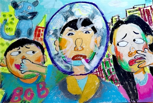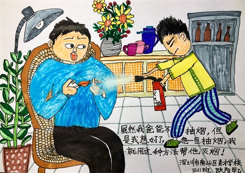 在有的作品里,小朋友举着巨大的剪刀,“咔嚓”一下剪断了冒着黑烟的香烟;还有一幅作品里,一个小男孩正举着灭火器喷向爸爸手中点燃的香烟。小作者说:虽然我爸爸不抽烟,但我想好了,他一旦抽烟,我就用这种方法帮他灭烟……