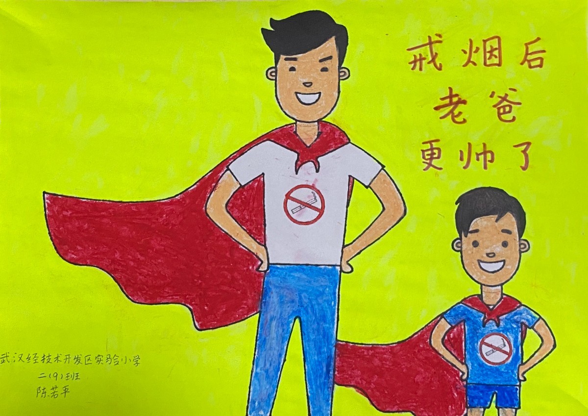 在获奖学生绘画作品中,有的小朋友将戒烟后的爸爸描绘成穿着红斗篷的超人,并配文称:“戒烟后,老爸更帅了!”