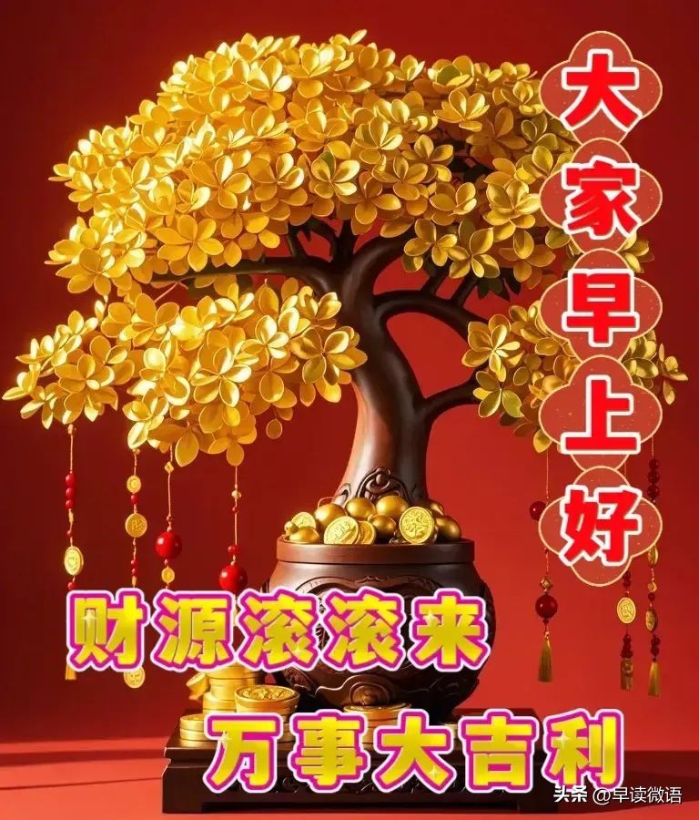 清晨送上最美好的祝福,朋友早安!愿你一天幸福如意!财源滚滚,恭喜发财永远满怀。健康长寿伴随,吉祥如意万事顺。开心愉快,幸福快乐每分每秒!