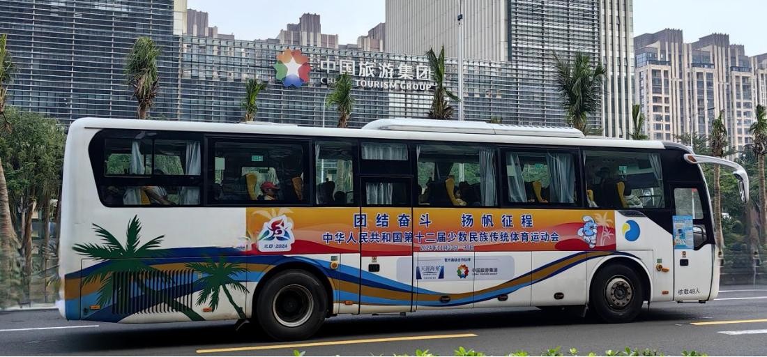 赛事期间,中国旅游集团旗下中旅汽车海南公司的车辆穿梭于城市的大街小巷。210辆大巴车载着参会嘉宾、运动员代表及工作人员,安全、准时地抵达每一个目的地。每一辆涂装着集团logo的大巴车,都是这座城市中一道亮丽的风景线,见证了中国旅游集团对这场民族盛会的全力支持和保障。