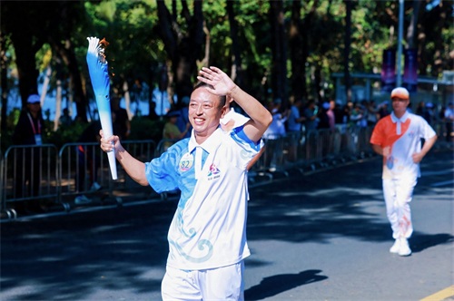 “中旅人”尹军华参加火炬实地传递活动。中国旅游集团供图
