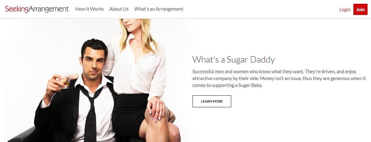 Seeking Arrangement是一个约会网站,致力于为富裕的“金主爸爸”和有吸引力的“宝贝甜心”配对,为他们找到使“生活更美好”的伴侣。约会的报酬包括晚餐、礼物、旅行和其他形式的经济支持。Seeking Arrangement还宣传自己是人们借助富裕的伴侣获得助学贷款的一个渠道。