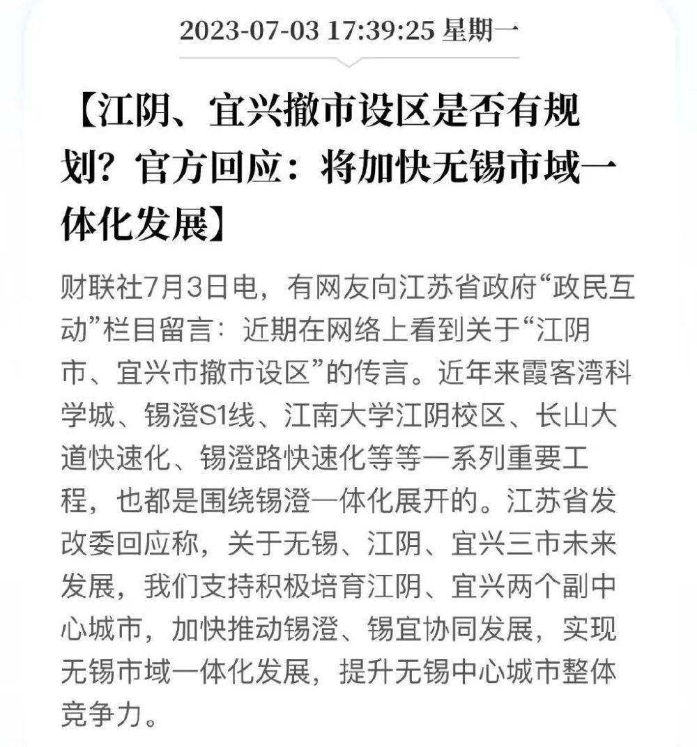 要知道,连无锡代管的江阴市、宜兴市的撤市设区的建议,都一直推动不下去,遑论将更大范围的苏锡常连成一体?