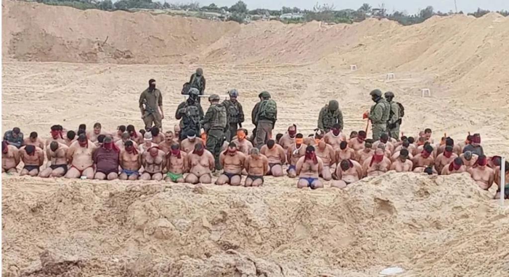 近日,显示 " 数十名加沙男子被脱衣拘押 " 的画面在社交媒体上流传,引发关注。在这些照片中,多名巴勒斯坦男性跪在地上,被人脱下衣服并蒙住眼睛。此外,据《以色列时报》9 日报道,社交媒体上流传的另一则视频显示,赤裸上身的巴勒斯坦伊斯兰抵抗运动(哈马斯)武装人员在以军士兵的督促下缴械投降。这些画面一经曝光,引发各方强烈谴责。