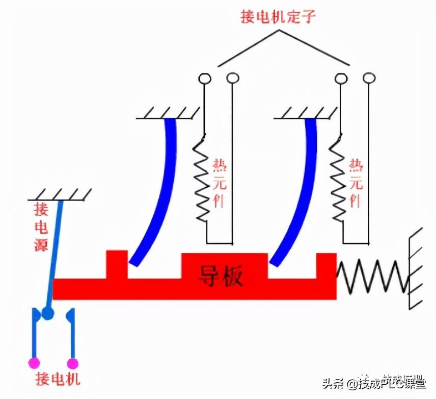 热继电器由发热元件、双金属片、触点及一套传动和调整机构组成;热继电器的工作原理:由流入热元件的电流产生热量,使有不同膨胀系数的双金属片发生形变,当形变达到一定距离时,就推动连杆动作,使控制电路断开,从而使接触器失电,主电路断开,实现电动机的过载保护。热继电器动作后,等双金属片经过一段时间冷却,按下复位按钮即可复位。