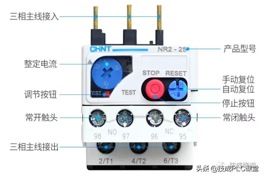 下图是热过载继电器的结构图,其主要包括有三相主线接入端和三相主线输出端,常开常闭触头,还有一下按钮,比如整定电流旋钮、TEST调节按钮、RESET复位按钮(手动/自动)、STOP停止按钮。整定电流旋钮是用于调节整定电流的,TEST调节按钮为试验按钮,检查热继电器能否正常动作,RESET按钮的功能是复位,热继电器动作后复位需要一定的时间,自动复位时间应在5min内完成,手动复位要在2min后才能按下停止按钮。