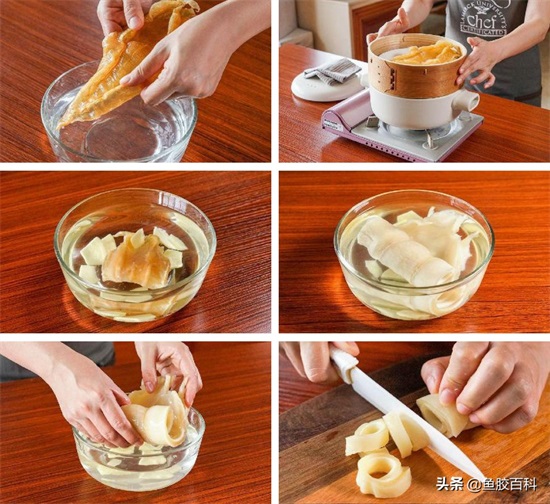 先蒸后泡,把花胶先上蒸锅蒸几分钟,之后再扔进冷水里泡几个小时,之后再换水泡过夜。此方法好处是花胶能被泡发的特别大,还能大大缩减炖煮时间,酒店一般都是用这种方法处理花胶,缺点是这样泡发后花花胶中的胶质已流失大半,所剩无几。