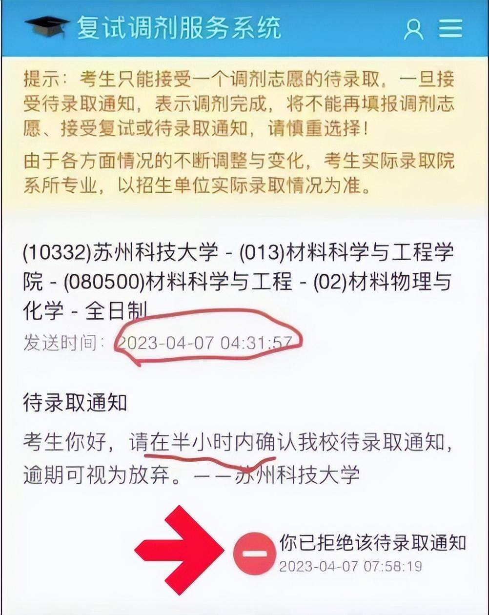 然而,这名考生看到邮件后,却直接傻眼了,因为邮件末尾赫然罗列着一行小字“你已拒绝该待录取通知”,这封邮件来自凌晨的四点31分,要求考生们在半小时内确认待录取结果,逾期就视为放弃!