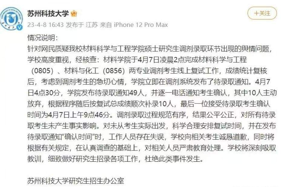 这项奇葩操作,直接将苏州科技大学置于风口浪尖,或许是舆论压力太大,苏科大扛不住压力了,终于发布声明公开道歉,承认未能从考生们实际出发,科学合理安排时间,是工作上的失误。