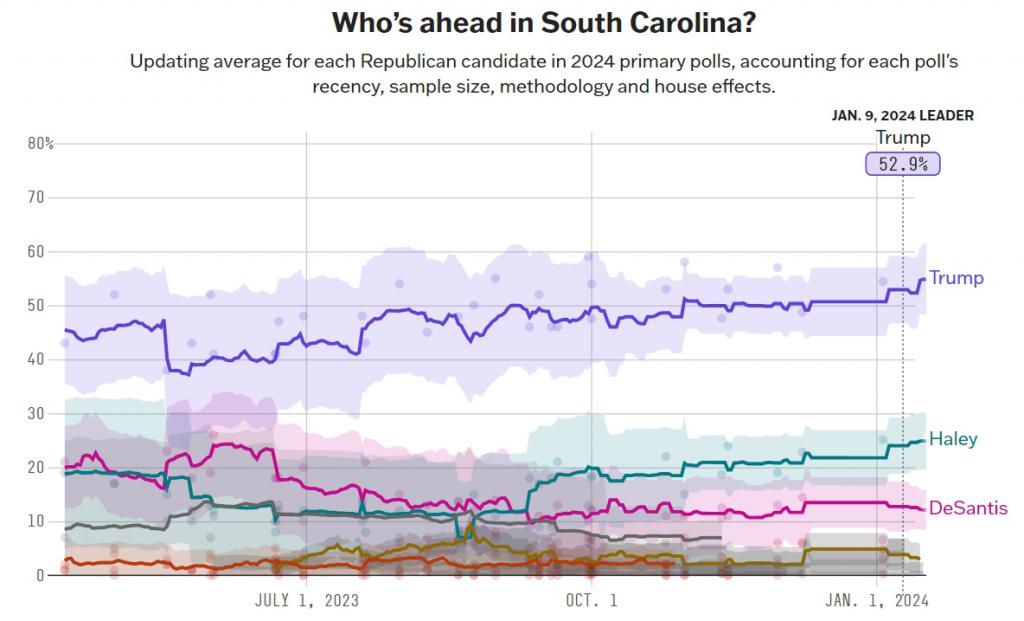 按照日程,在下周新罕布什尔州初选过后,共和党的候选人们将歇息两周,到 2 月 8 日再战内华达州,随后就是 2 月底的南卡罗来纳州初选,黑利也曾在南卡州当过州长。
