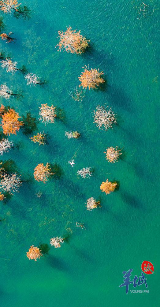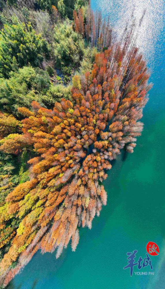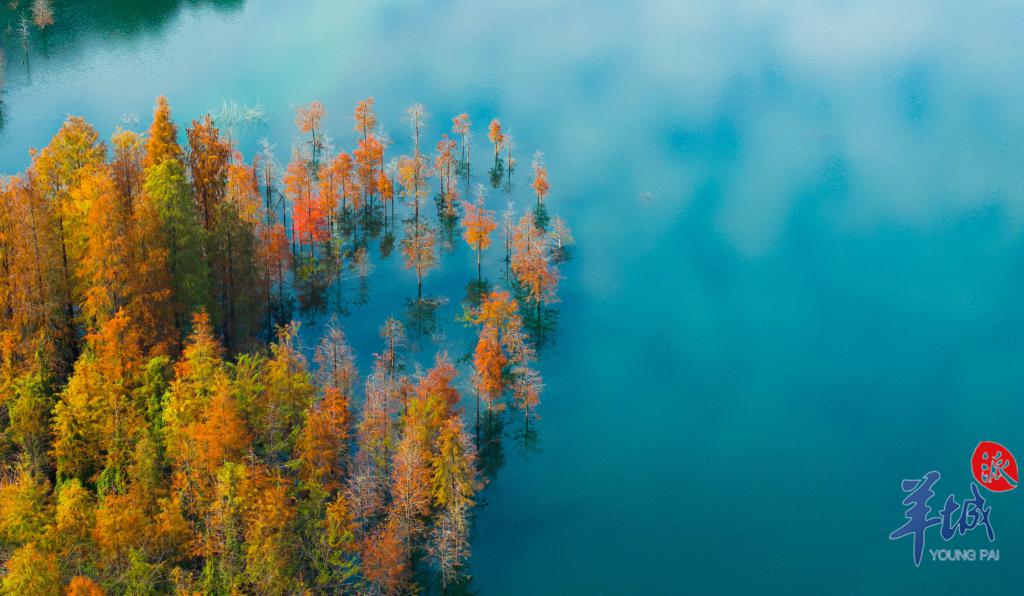 从空中俯瞰,大自然在这里把所有色彩都运用得恰到好处,漫山彩林呈现出五彩斑斓的旖旎风光。航拍视角下的落羽杉宛如一朵朵绽放的鲜花,与蓝天碧水相映成趣,青、黄、橙、红等交织争艳,恰似人间仙境。