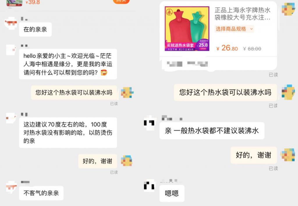 在相关话题区,有网友提及 " 冷知识,不管什么热水袋都不能装沸水。" 事实到底如何?浙江在线记者就此问题询问了多名售卖热水袋的淘宝商家。有部分商家表示其销售的热水袋可以装沸水,与此同时也有不少商家表示热水袋中不建议装沸水,70 ℃左右的水温为最佳温度。