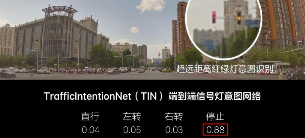 针对城市道路的另一个挑战——红绿灯路口通行,理想也提出了 TIN 信号灯通行意图网络方案。不像传统方案那样检测红绿灯的具体状态,TIN 主要通过历史图像数据,如路口图像和车辆本身的油门刹车数据,学习红绿灯和车辆行驶意图的对应关系。最终 TIN 网络就能直接给出左转、右转、直行、停止 4 个红绿灯状态概率值,比如绿灯概率值最高为 75%,那么车辆就会选择直行。