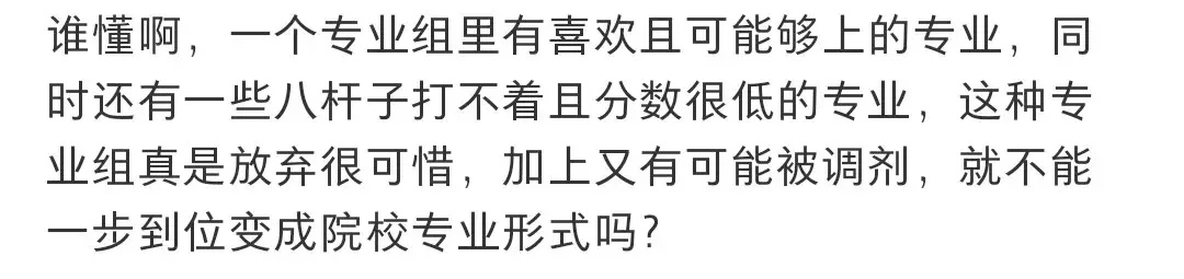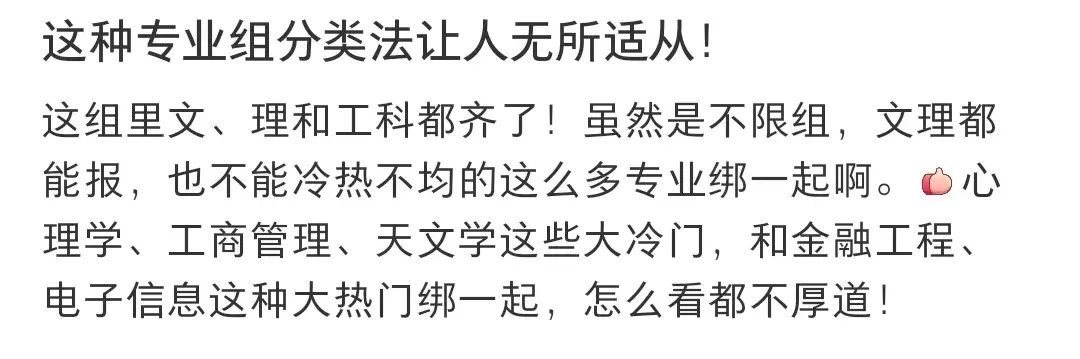 对于这样的专业组分类,考生也是吐槽不断。特别是那些分数在600分以上,但是和想报考院校专业往年最低排位相差无几的学生。他们为了保住报考学校的层次,就必须报考这样的专业组。这样一来,他们将承受巨大的被调剂风险。