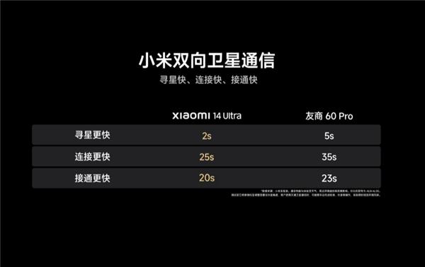 在寻星速度方面,小米 14 Ultra 用时 2 秒完成寻星,而友商 60 Pro 用时 5 秒;在连接速度上,小米 14 Ultra 用时 25 秒,友商 60 Pro 用时 35 秒。