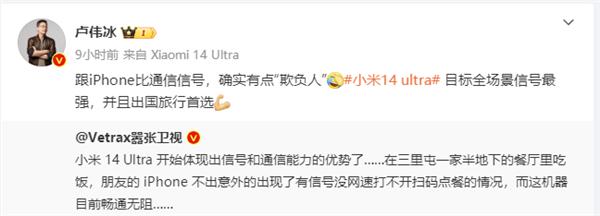 对此,小米卢伟冰回应:" 跟 iPhone 比通信信号确实有点‘欺负人’,小米 14 Ultra 目标是全场景信号最强,并且出国旅行首选。"
