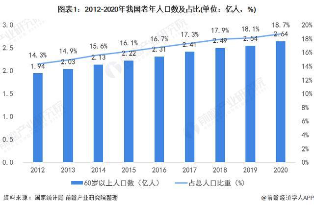 从 2012-2020 年我国老年人口数量及占比来看,我国老年人口及占比均呈上升趋势。2020 年我国老年人口数达 2.64 亿人,占总人口数达 18.7%。