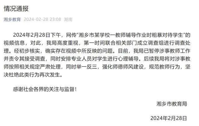 2 月 28 日,一段湖南省湘乡市某小学教师因学生不会做题而对其进行殴打辱骂的视频引发网友热议。据当地教育局 28 日晚通报称,该局已暂停涉事教师工作并责令其接受调查,同时安排专业人员对学生进行心理辅导。