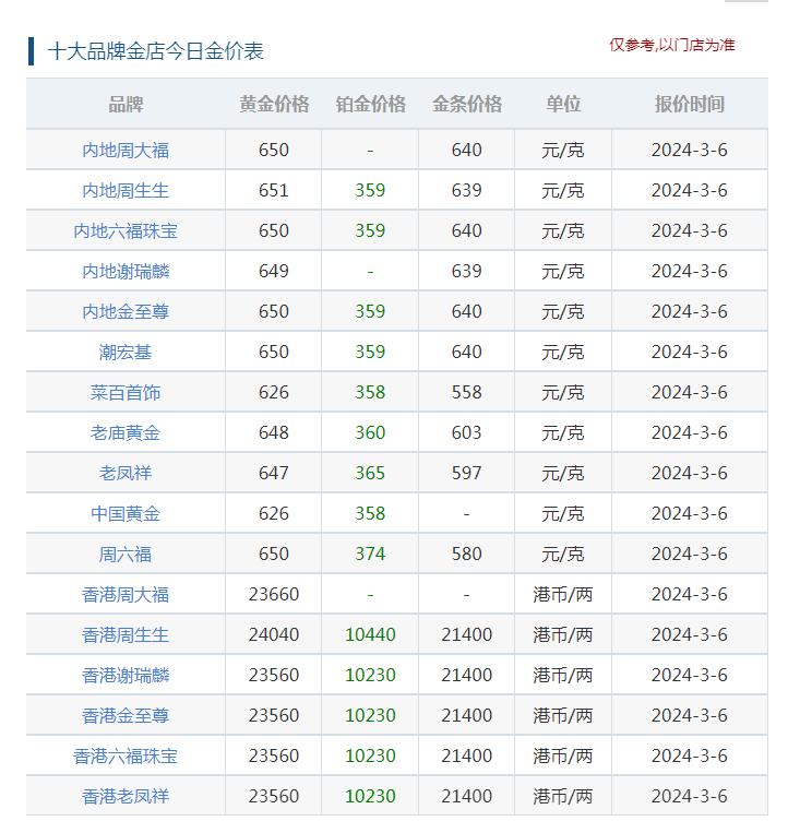 记者走访后发现,近一段时间,随着金价持续上涨,金店的金价已经从 2 月中下旬的每克 605-635 元,上涨到目前最高 650 元左右。同时,金店在售卖黄金饰品时有一定加工费用,以大多数消费者关注的纯金手镯为例,30 克左右的手镯,加工费约在 500 元 -1500 元区间内不等。