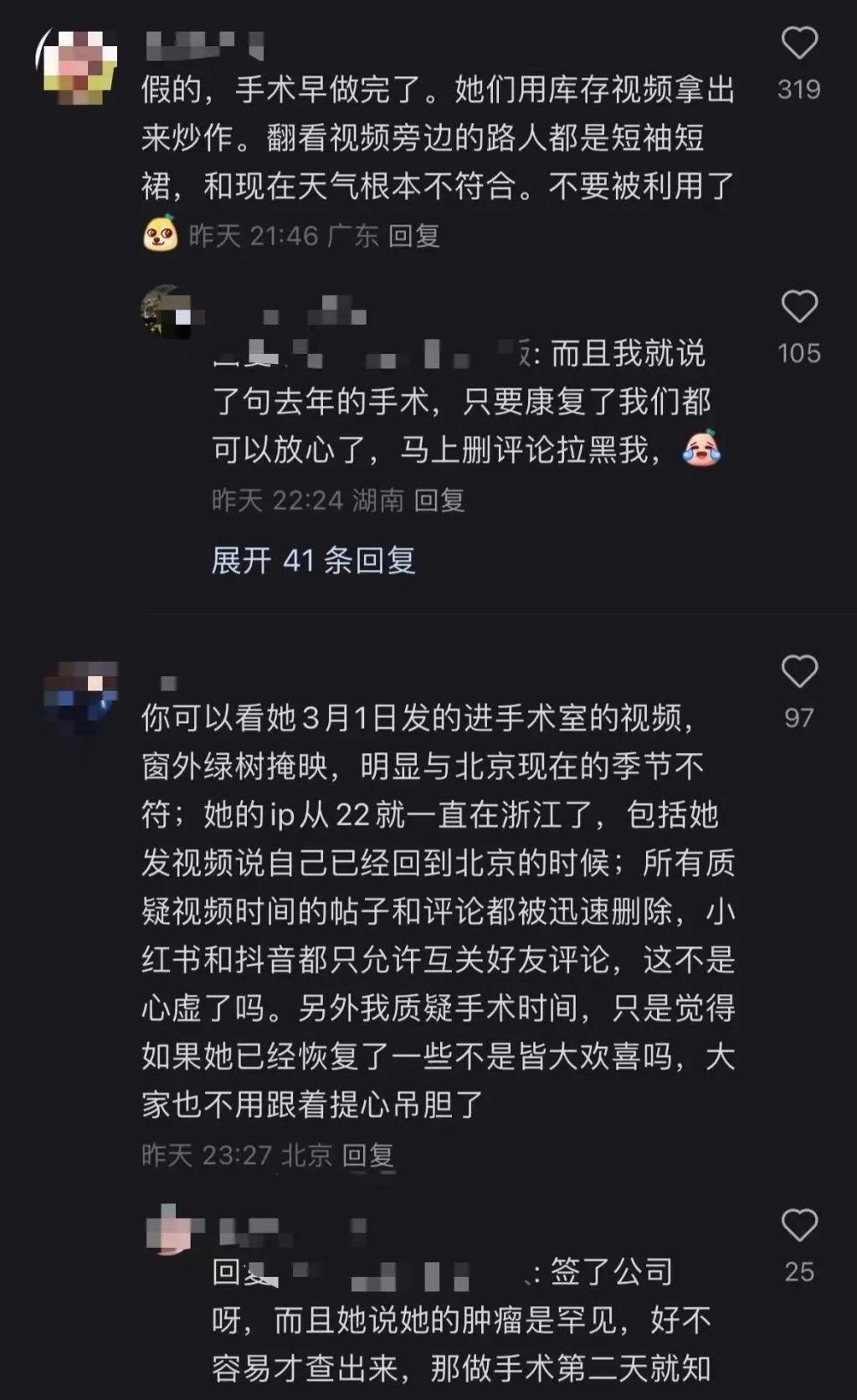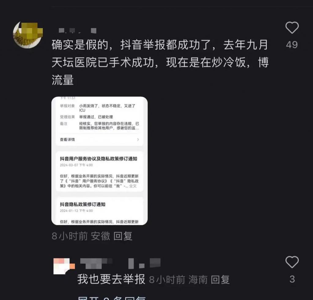 这些都让网友们渐渐开始怀疑这场手术的真实性,有网友评论称其去年十月份就已经在天坛医院完成手术,好奇为什么她的妈妈假装直播进程,也有人称曾留言 " 去年的手术,只要康复了我们都可以放心了 " 却被删评拉黑。