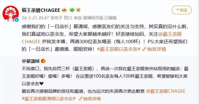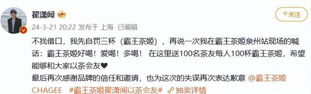 3 月 21 日,翟潇闻道歉:" 不找借口,我先自罚三杯(霸王茶姬),再说一次我在霸王茶姬泉州站现场的喊话,霸王茶姬好喝!爱喝!多喝!在这里送 100 名茶友每人 100 杯霸王茶姬,希望能够和大家以茶会友。最后再次感谢品牌的信任和邀请,也为这次的失误再次表达歉意。"