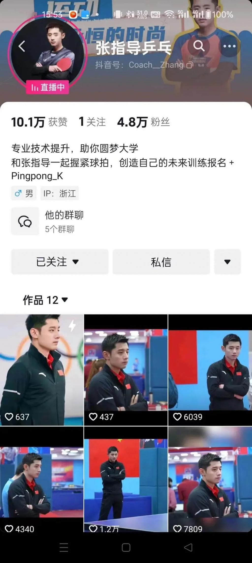 张继科此前的个人账号在该短视频平台已有 840 万粉丝,但 2023 年 2 月份就已断更,而截至 4 月 3 日下午," 张指导乒乓 " 的新账号目前已有 4.7 万粉丝。