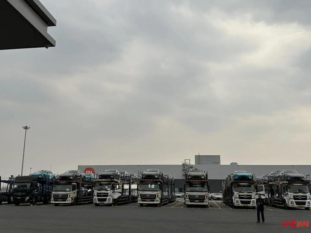 4 月 5 日,红星资本局来到位于北京经开区的小米汽车生产园区,看到十余辆轿运车停在厂区内整装待发。