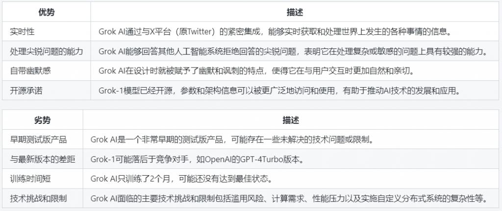 而 GPT 的多数产品不行,比如 GPT3.5,其信息截至 2021 年;比如 GPT-4 Turbo,信息更新至 2023 年 4 月。但 Grok AI 也有明显的缺点,比如训练时间短,属于早期测试产品,部门功能弱于 GPT-4 Turbo。