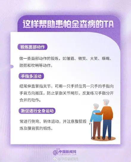 此外,临床中很多帕金森病患者心理负担较重,约 35% 到 45% 的帕金森病患者伴发焦虑、抑郁。家人应多给予鼓励与赞赏,以增强患者康复的愿望。