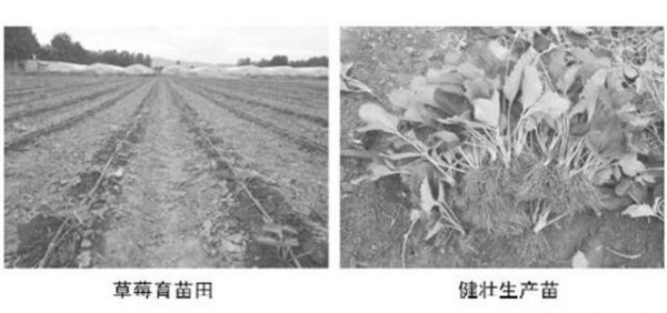 育苗后期应适当施用磷钾肥,控制施用氮肥,采取断根、摘叶等措施,使匍匐茎子苗提前进行花芽分化。进入8月,育苗田一般不再施肥,草莓新叶出生速度变慢,叶片颜色逐步转淡成绿中稍黄。进入8月下旬,如果长势仍较好,可采取断根措施,用铁锹在子苗周围铲断地下根系,抑制子苗根系对养分、水分的吸收,降低植株氮素营养水平。还可采取摘叶措施,将子苗下部的老叶全部摘去,只留下上部2张展开叶片及未完全展开的心叶,促进花芽分化。