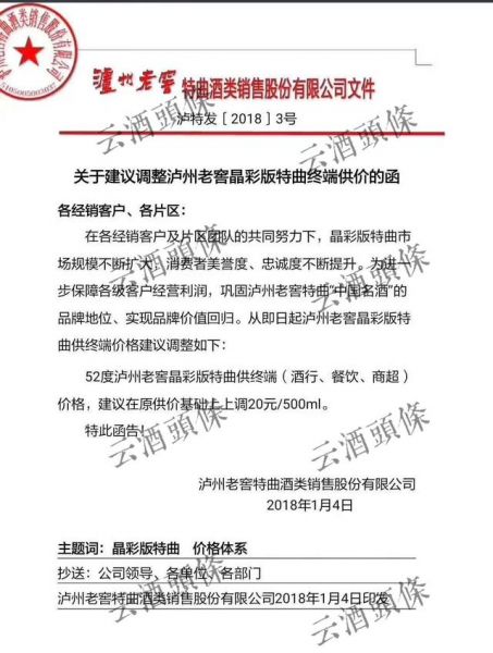 1月4日,泸州老窖酒类销售股份有限公司印发《关于建议调整泸州老窖晶彩版特曲终端供价的函》。