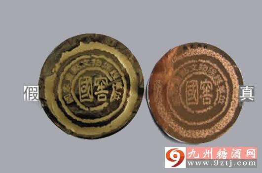 老包装的国窖酒的造假方法,大部分都是利用回收的旧瓶子和旧包装盒,再装上低档酒,贴上防伪标志后销售。有时候盒子上的仿伪号码没有被消费者刮开,造假者继续利用,所以有时拨打电话查询也无法获得真实信息,在此提醒大家:老包装用电话查询不准确。从酒标上来鉴别的话,一般假的图案无立体感,颜色呈黄铜色,而真标颜色呈紫铜色并富有立体感。(如下图)