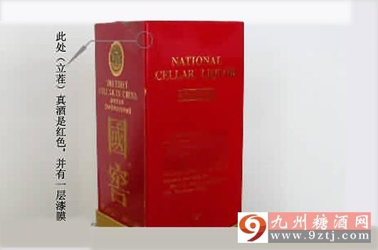 其三、盒的结合部(纸板的立茬)应该是红色的,并有一层漆膜、综合审阅国窖1573的商标名称、色泽、图案以及标签、瓶盖、酒瓶、合格证、礼品盒等方面的情况。包装的边缘接缝齐整严密,没有松紧不均、留缝隙的现象。(如下图)