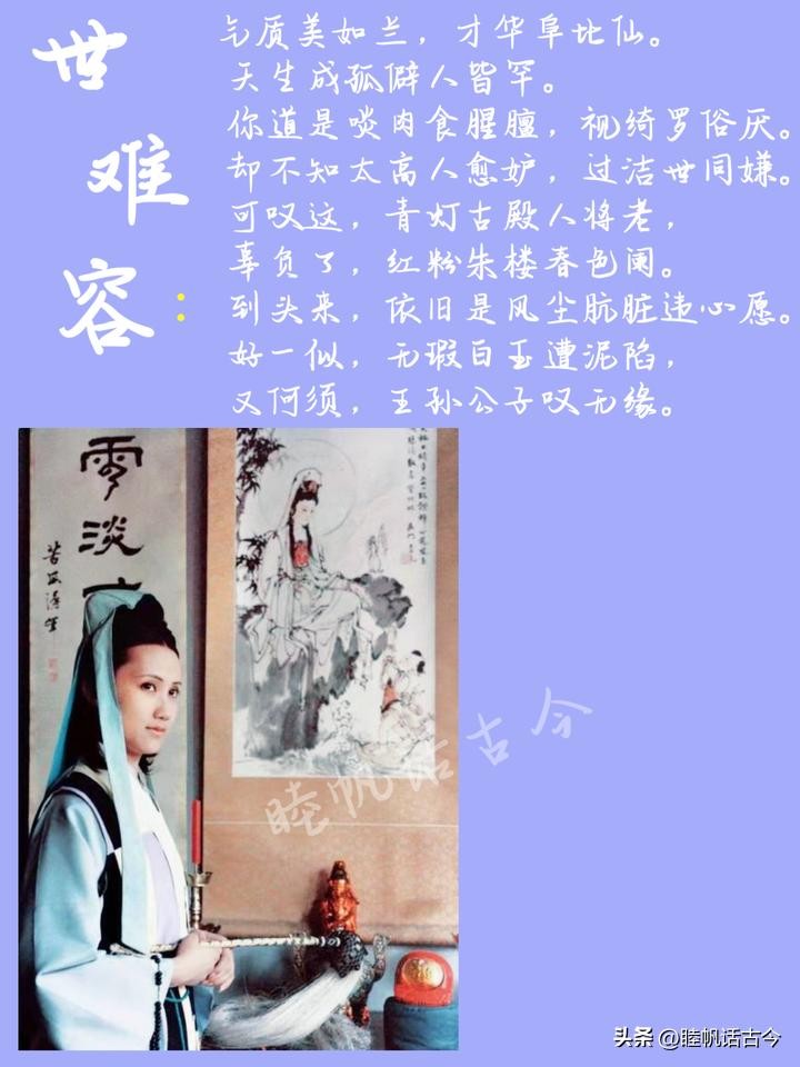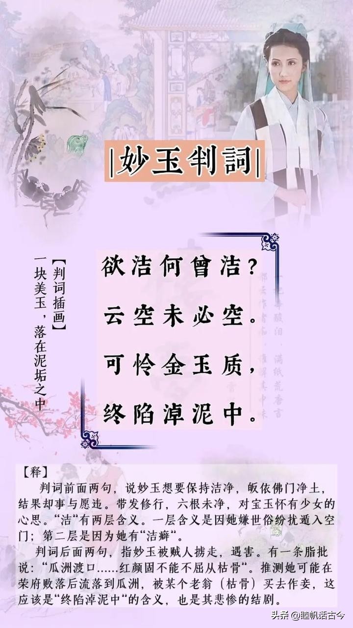 妙玉出身于苏州一个读书仕宦之家,因自小多病才出家当了尼姑。她文墨也极通,模样又极好,也是大观园中的一位姣姣者。说她洁,是因她嫌世俗社会纷纷扰扰不清净才遁人空门,这是一层含义。而她又有洁癖,刘姥姥在她那里喝过一次茶,她竟要把刘姥姥用过的一只名贵的成窑杯子扔掉。她想一尘不染,但那个社会不会给她准备那样的条件,命运将把她安排到最不洁净的地方去。按规矩,出家就要六根净除,可她偏要带发修行,似乎还留一手,这是她尘缘未了,尘心末断的一个根据。