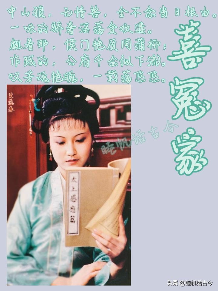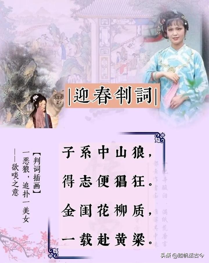 ●首句子系中山狼中子系二字合成孙的繁体字“孫”,指的是迎春的丈夫孙绍祖。中山狼用的是《中山狼传》的典故,喻凶狠残暴而又忘恩负义的人。这里是比喻迎春丈夫孙绍祖的险恶狠毒。