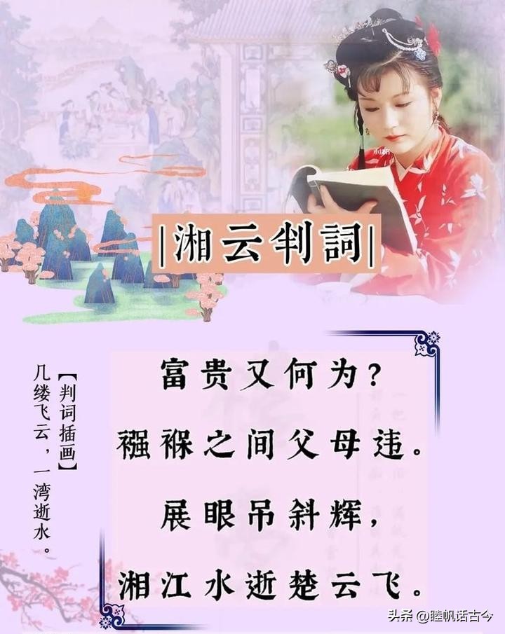 ●展眼吊斜辉,湘江水逝楚云飞☞第三句展眼吊斜辉说的是转眼之间,只有湘云一人独自面对落日感伤了。最后一句湘江水逝楚云飞点出了湘云二字。湘江在湖南,地属古代的楚国,故有楚云之称。湘江流逝,楚云飞散,隐喻史家衰败以及湘云夫妇生活的短暂,用的是楚怀王梦见巫山神女与之欢会的典故。