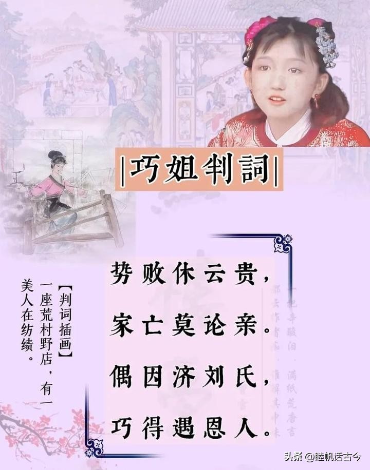 ●第三句偶因济刘氏是指巧姐的母亲王熙凤曾接济过村妇刘姥姥。