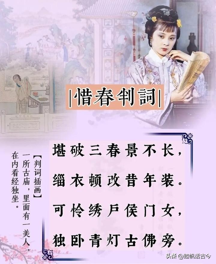 ● 第三、四句可怜绣户侯门女,独卧青灯古佛旁☞指出贾府小姐惜春最后出家为尼,再也不是公府千金而是过着缁衣乞食的生活。当然,这里的乞食并不一定就指像乞丐一样讨饭,但生活艰难,颠沛流离的命运是难以逃脱的。 这首判词写惜春由三个姐姐的不幸遭遇预感到,自己将来也不会有好结果,决定出家为尼。但这条逃避现实的道路凄凉孤独,仍然是行不通的。诗里流露的同情与惋惜,明显地反映了作者的矛盾心情。