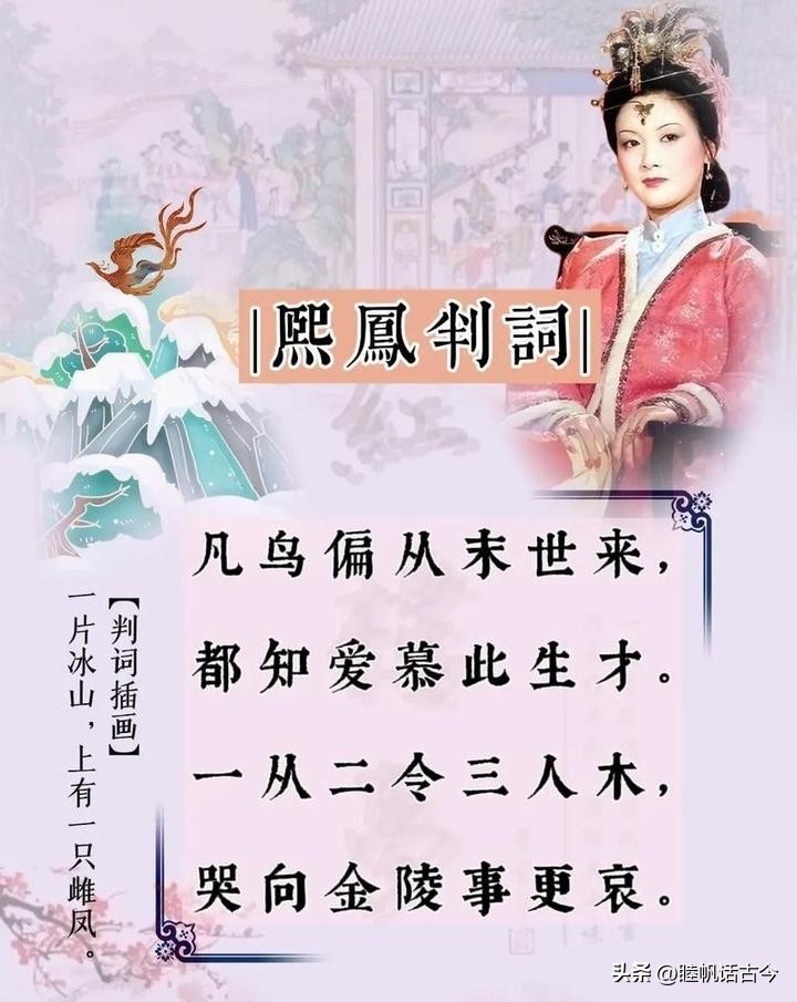 ● 凡鸟偏从末世来☞指的是凤姐这么一个能干的女强人生于末世的不幸,凡鸟是繁体里的“鳯”字,也就暗指王熙凤。从凤字拆出来得凡鸟二字比喻庸才,借用吕安对喜的典故,点出凤,自然是种讥讽。画里的雌凤所靠着的冰山,指的就是将融化的贾府所象征的靠山。