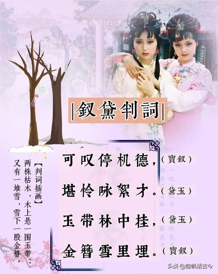 配图:(画着两株枯木,木上悬着一围玉带,又有一堆雪,雪下一股金簪)