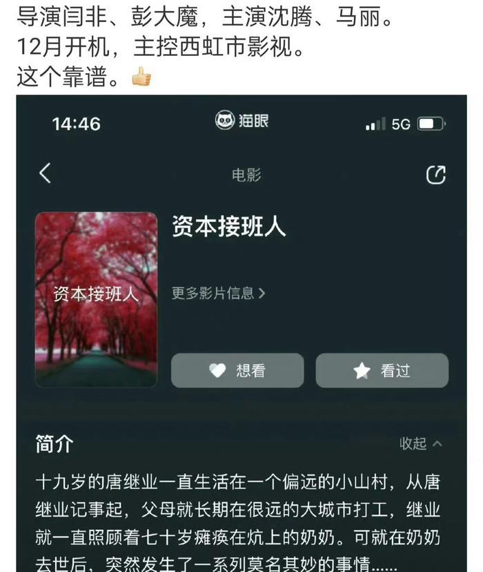 #沈腾马丽又有新电影了吗##沈马组合又有新电影了# 西虹市首富导演目非、彭大魔新电影 《资本接班人》 过审 ,主演沈腾、马丽。