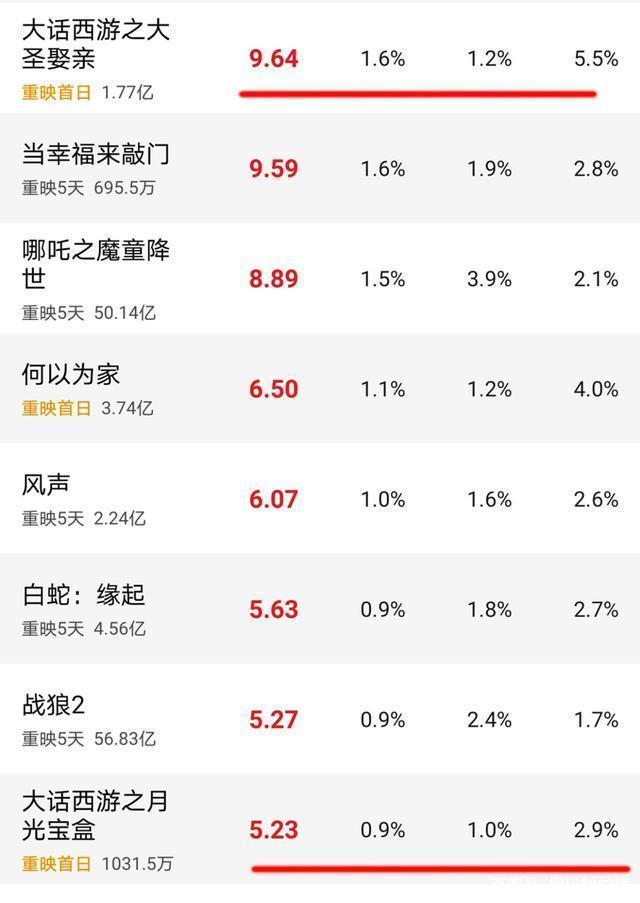 没有好的新电影上映,影院采也取重映的方式。而重映选择影片也是非常有考究的,比如选择当时首映时票房高的电影《哪吒之魔童降世》,再比如剧情非常吸引人的《误杀》,再比如让大家难以释怀的《大话西游》。从首日重映的票房来看,喜欢怀旧的中国人对《大话西游》的重映非常关注。《大话西游》因时长限制,分为上下两集《大话西游之月光宝盒》、《大话西游之大圣娶亲》。两集的票房加起来高达15万左右。