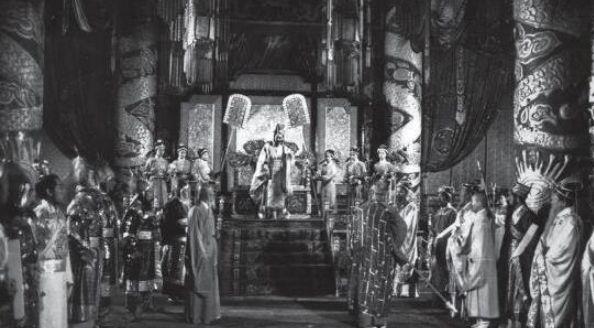 【《西游记》老照片:图2孙悟空的经典照片,图6女儿国国王】绍兴大禹王庙改造的唐王大殿——观音变化的老僧(郭家庆饰)、侍者(杨斌饰)正将宝袈裟和禅杖赠与唐王(张志明饰),以助唐僧(徐少华饰)前往西天取经【图片来源于网络】