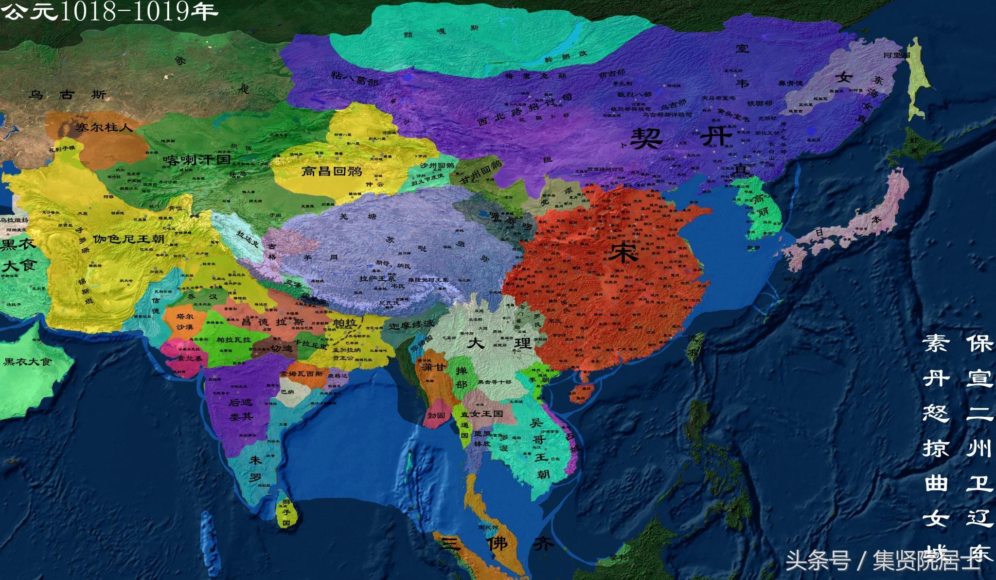 一千年前,也就是公元1018年,北宋真宗天禧二年。从下面的1018到1019年的地图,我们可以很清楚的看到,那时候的居延地区很明显不是属于中原王朝北宋的。从位置来看,居延当时应该属于契丹,中原王朝跑到契丹的领土上打土匪,这明显是违背1004年宋辽“澶渊之盟”和平共处精神的,在当时的历史背景下是绝对不可能发生的事情。
