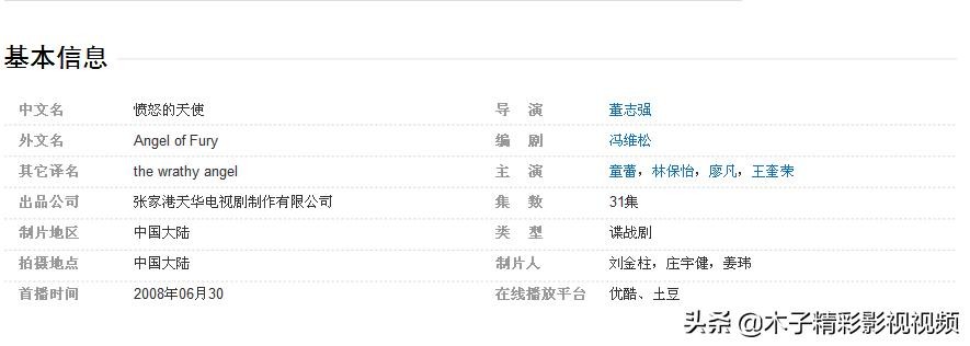 《愤怒的天使》是由董志强执导,童蕾、林保怡、廖凡、张少华、左翎等主演的谍战悬疑剧,于2008年06月30日全国播出 [1] 。